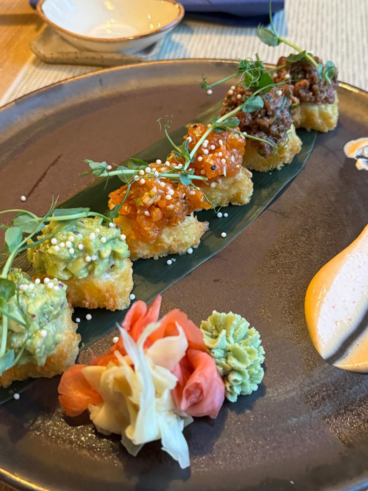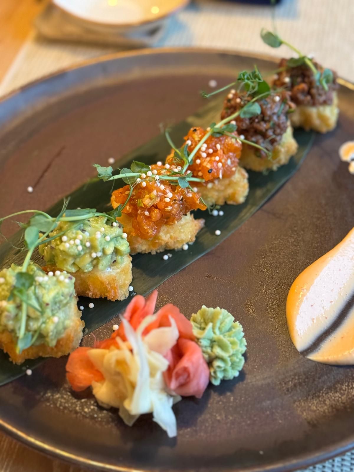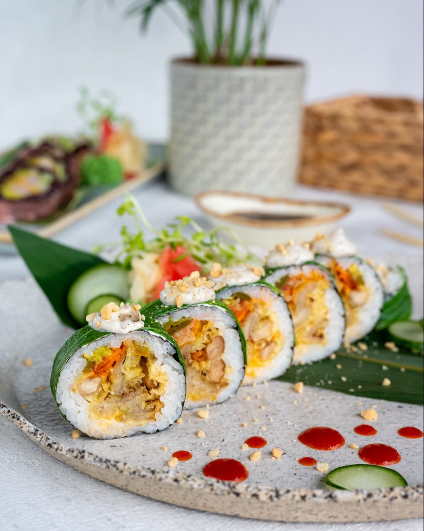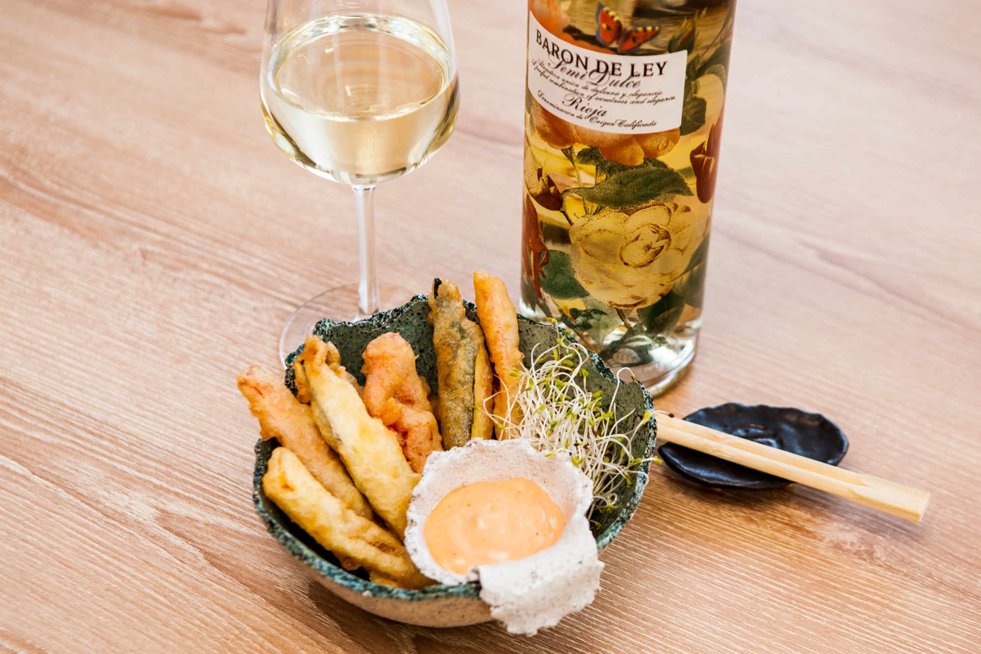 Grzybki shiitake, groszek cukrowy, por w tempurze, ogórek, spicy-mayo,obłożone ośmiornica z masłem KOLENDROWYM