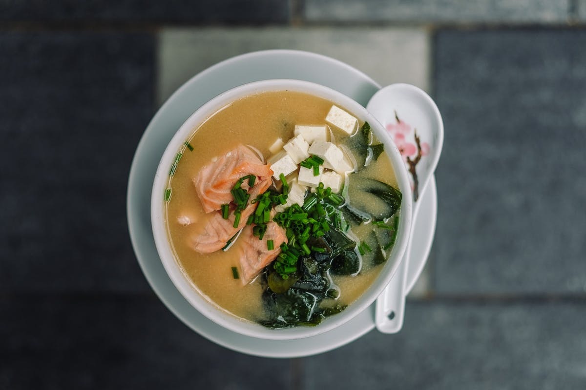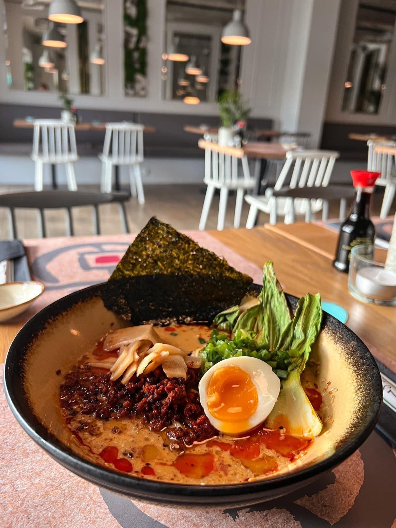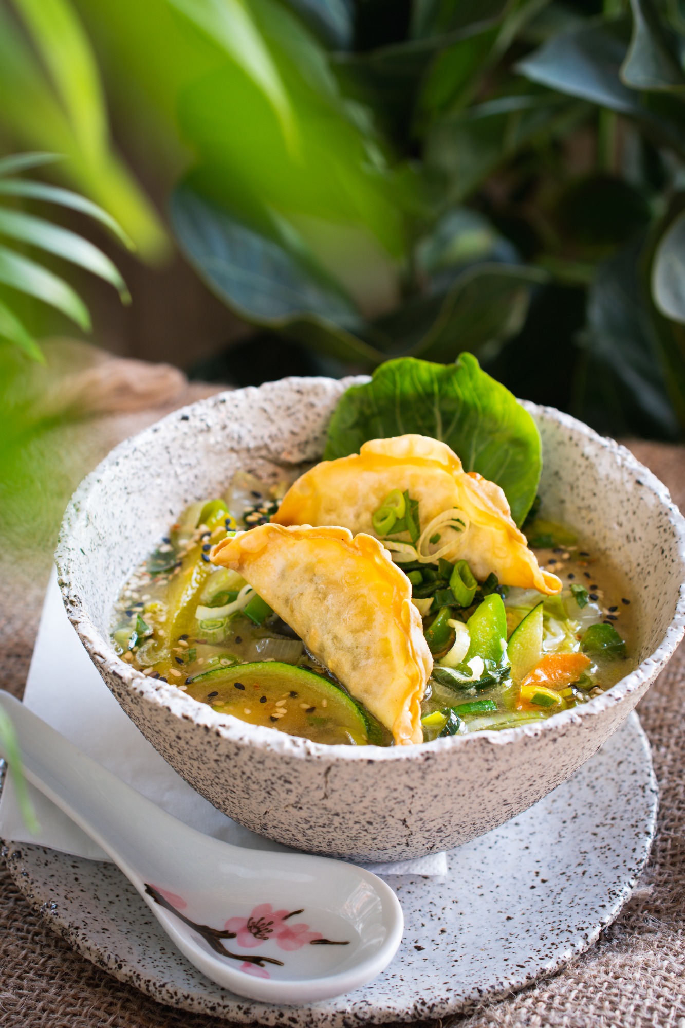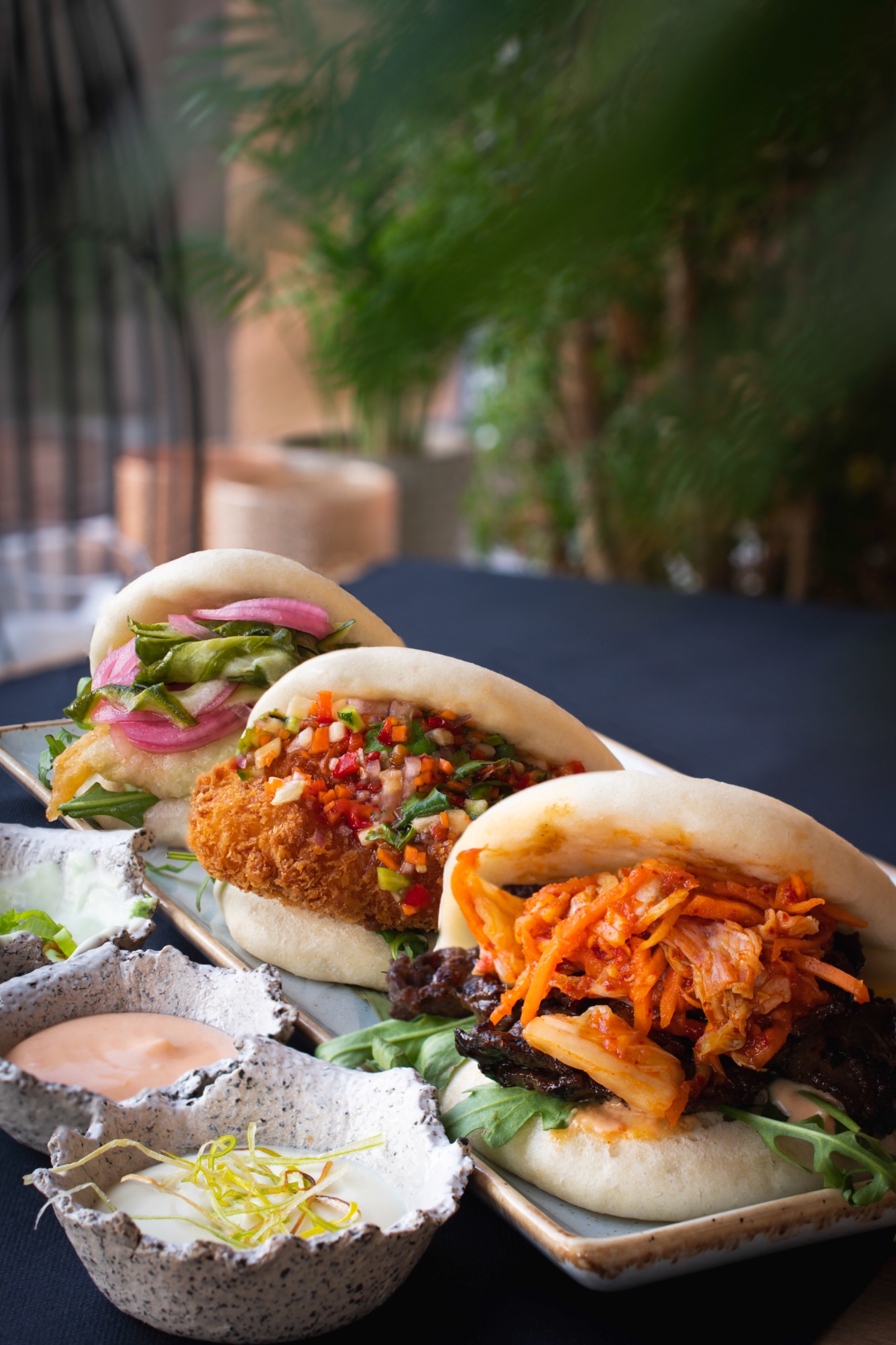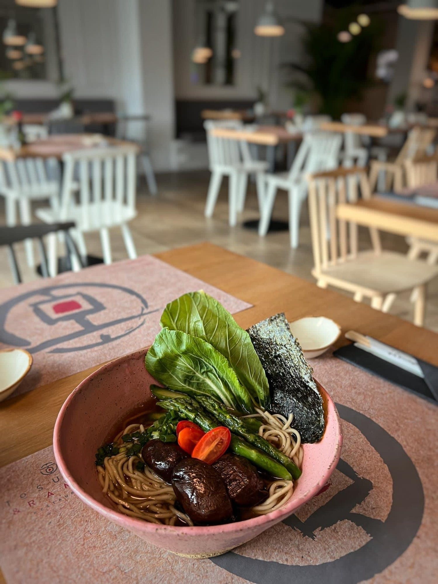 Grzybki shiitake, groszek cukrowy, por w tempurze, ogórek, spicy-mayo,obłożone ośmiornica z masłem KOLENDROWYM