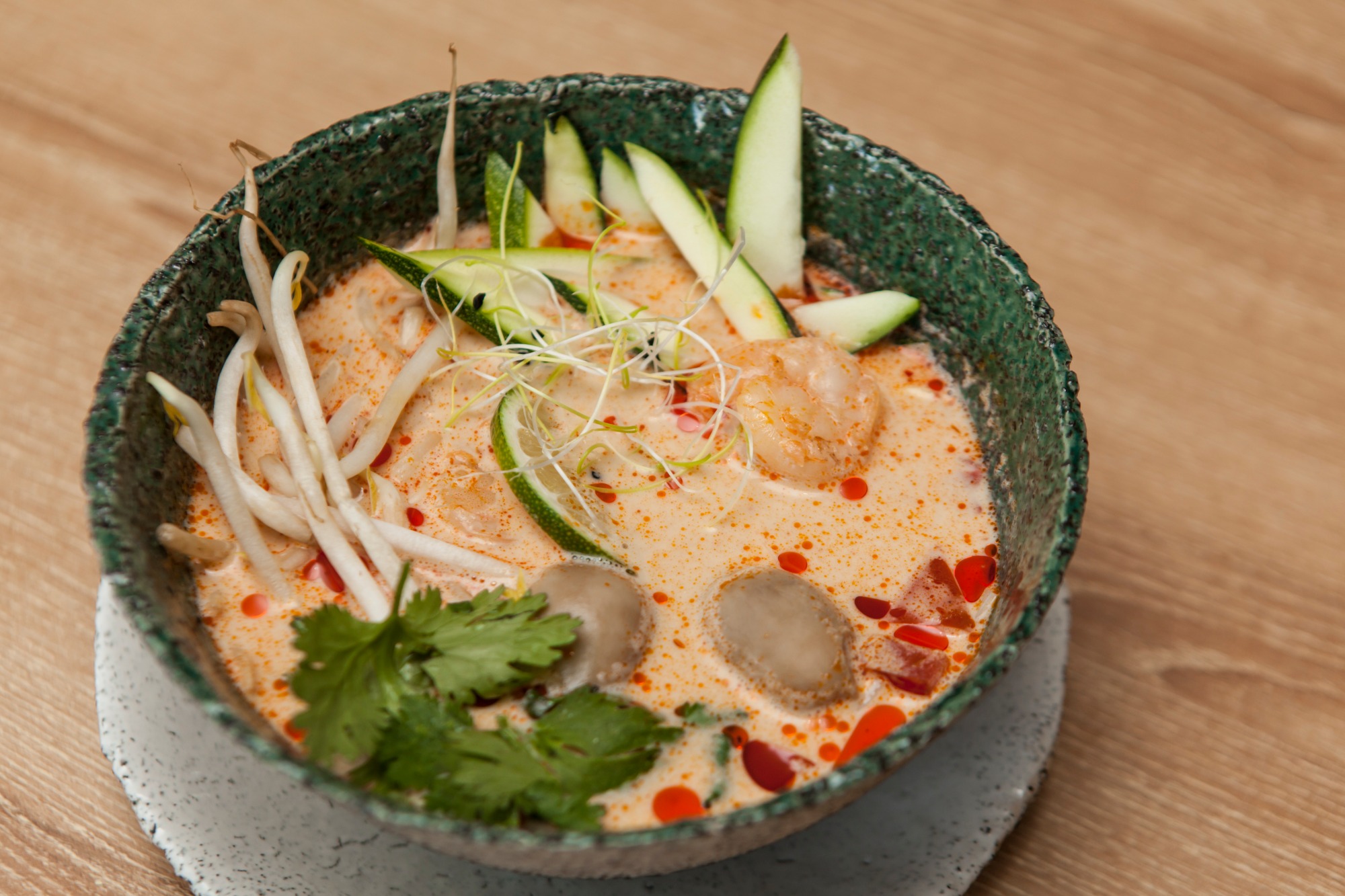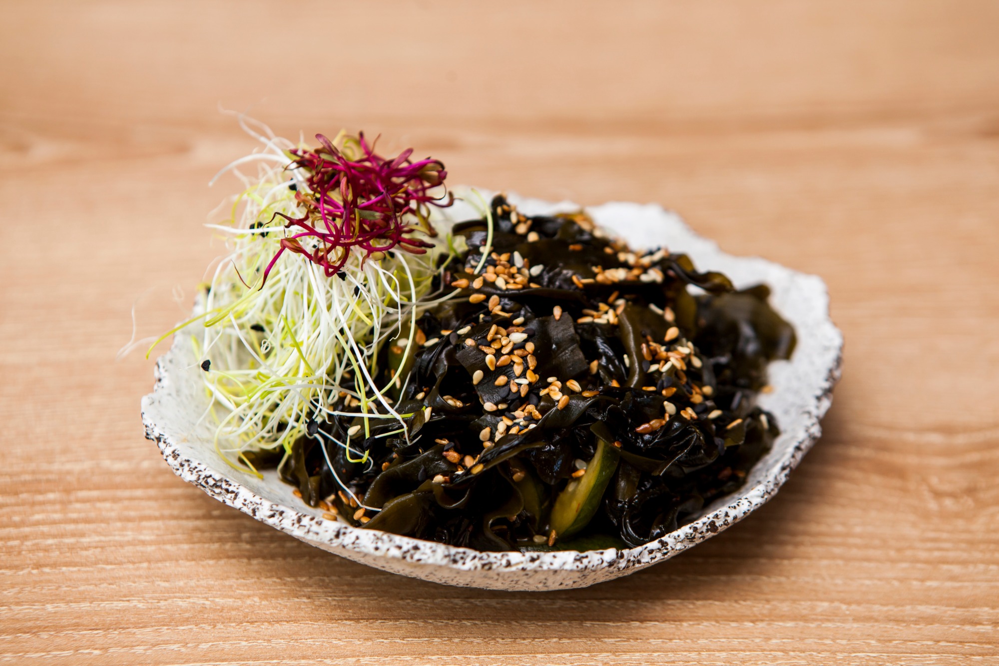 krewetka tygrysia w panco, ogórek, rzepa, czarny ryż, serek, płatek sojowy