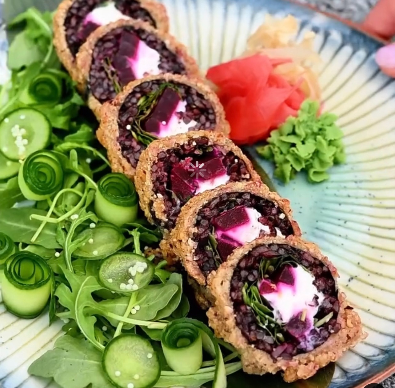 krab smażony w panierce panko, kimchi, rukola, spicymayo, owinięty opalanym łososiem i posypany chipsami z topinamburu, czarny ryż
