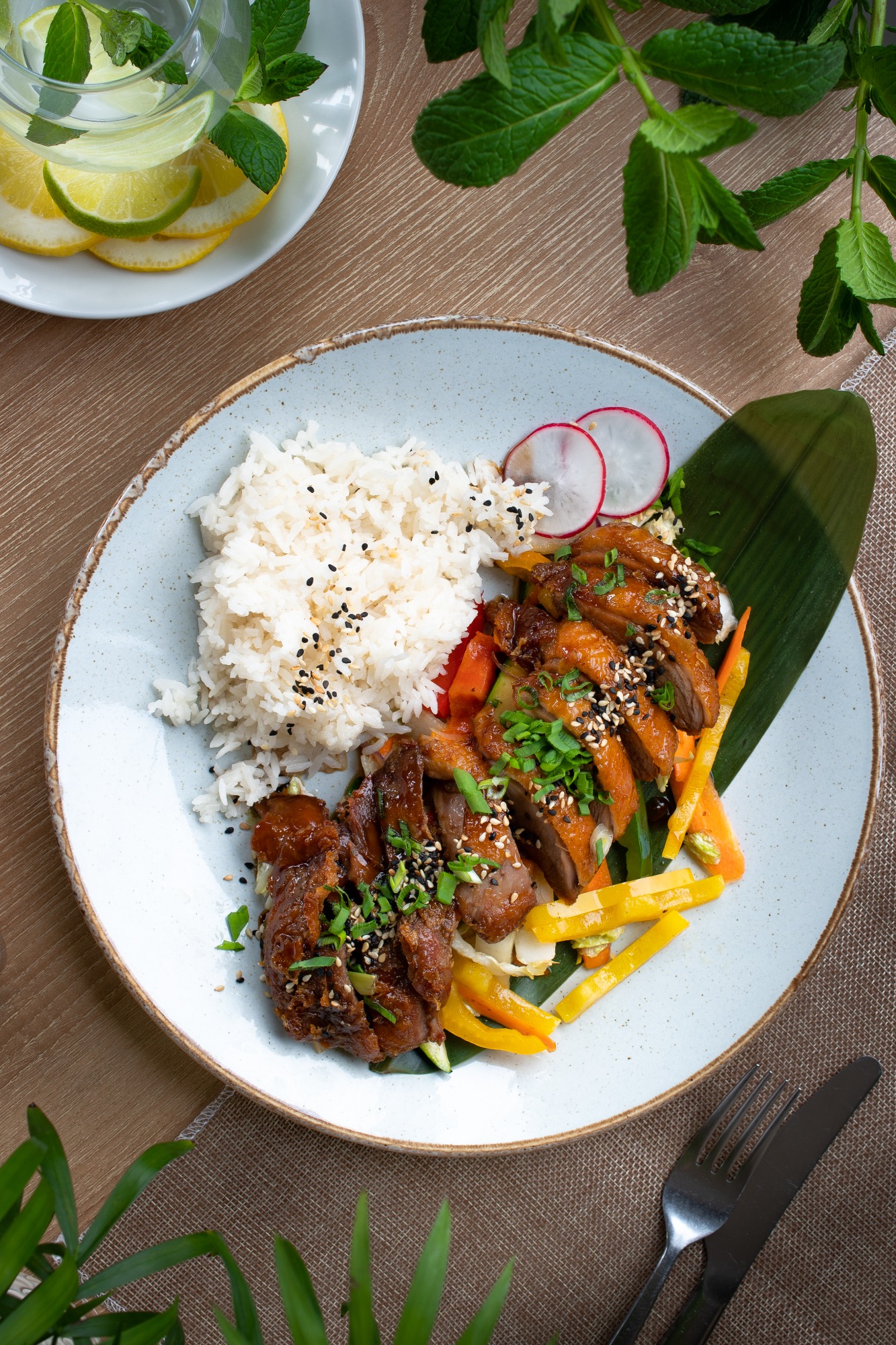 Spring Rolls z konffiowaną kaczką w papierze ryżowym z mango, warzywami i sosem orzechowym -