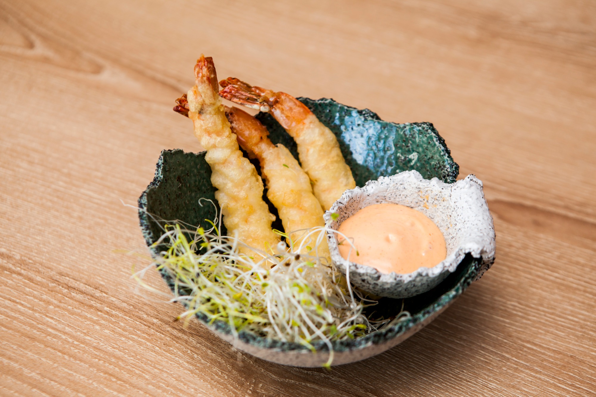 krewetka w tempurze, ogórek, rzepa, spicy mayo -