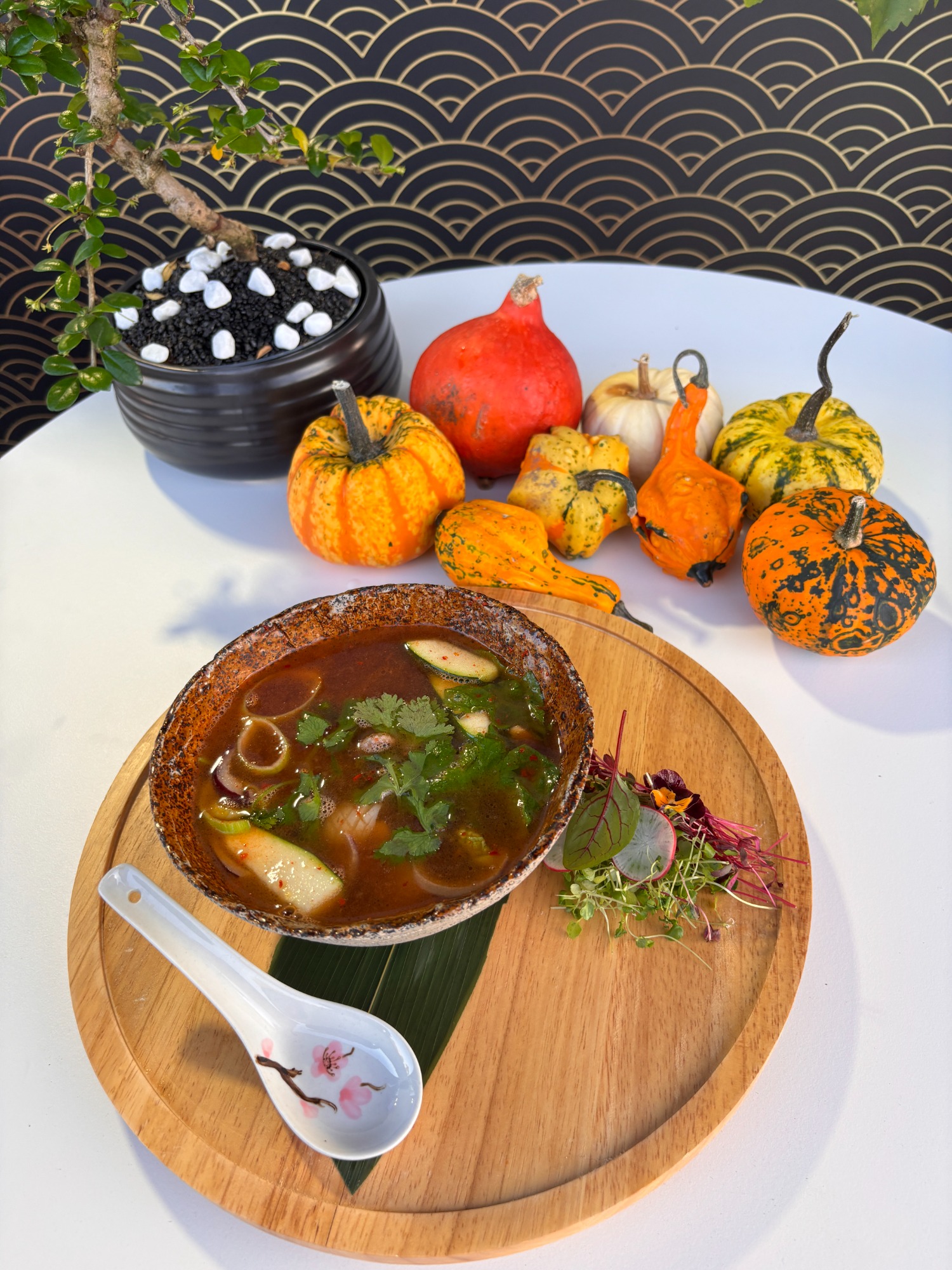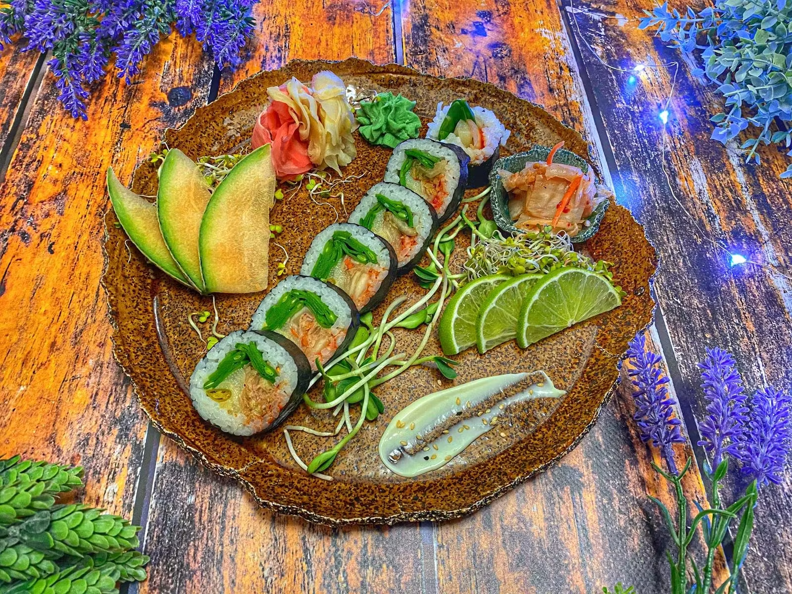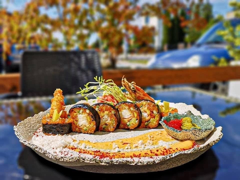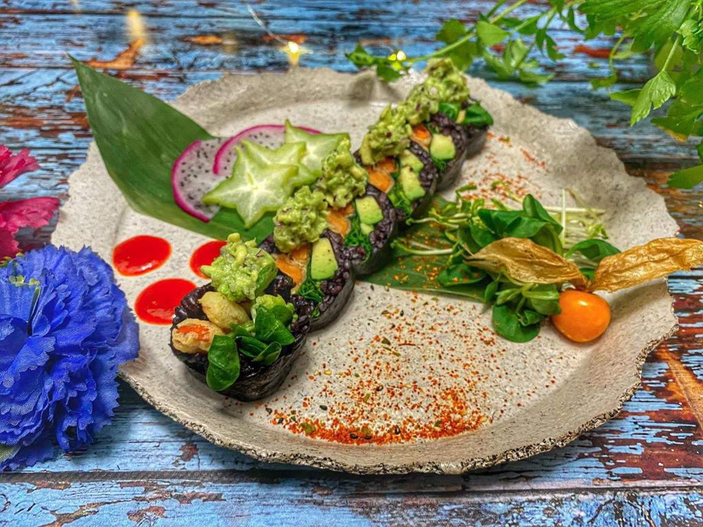 Grzybki shiitake, groszek cukrowy, por w tempurze, ogórek, spicy-mayo,obłożone ośmiornica z masłem KOLENDROWYM