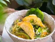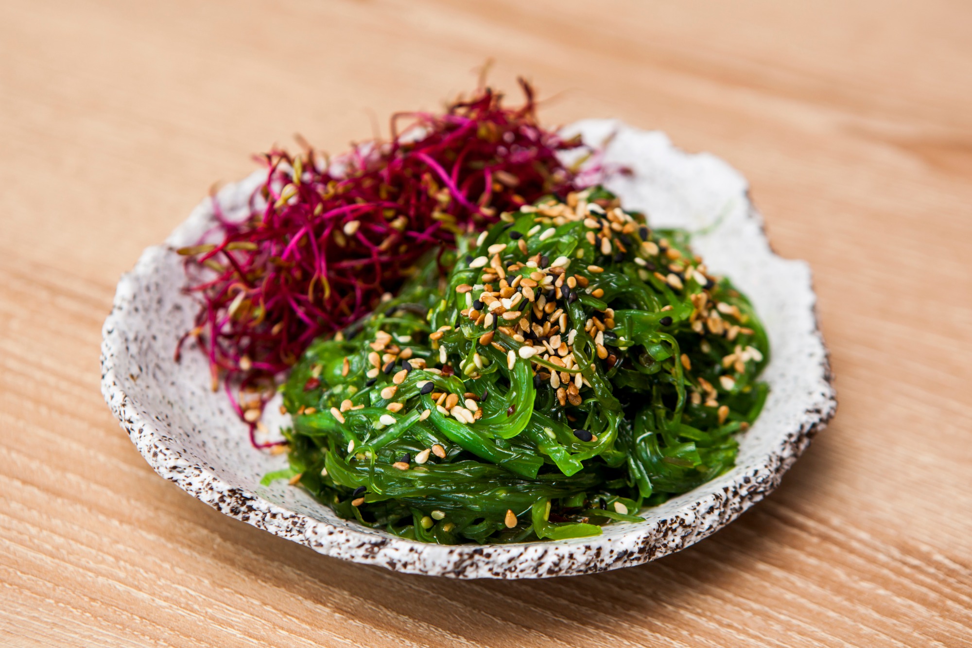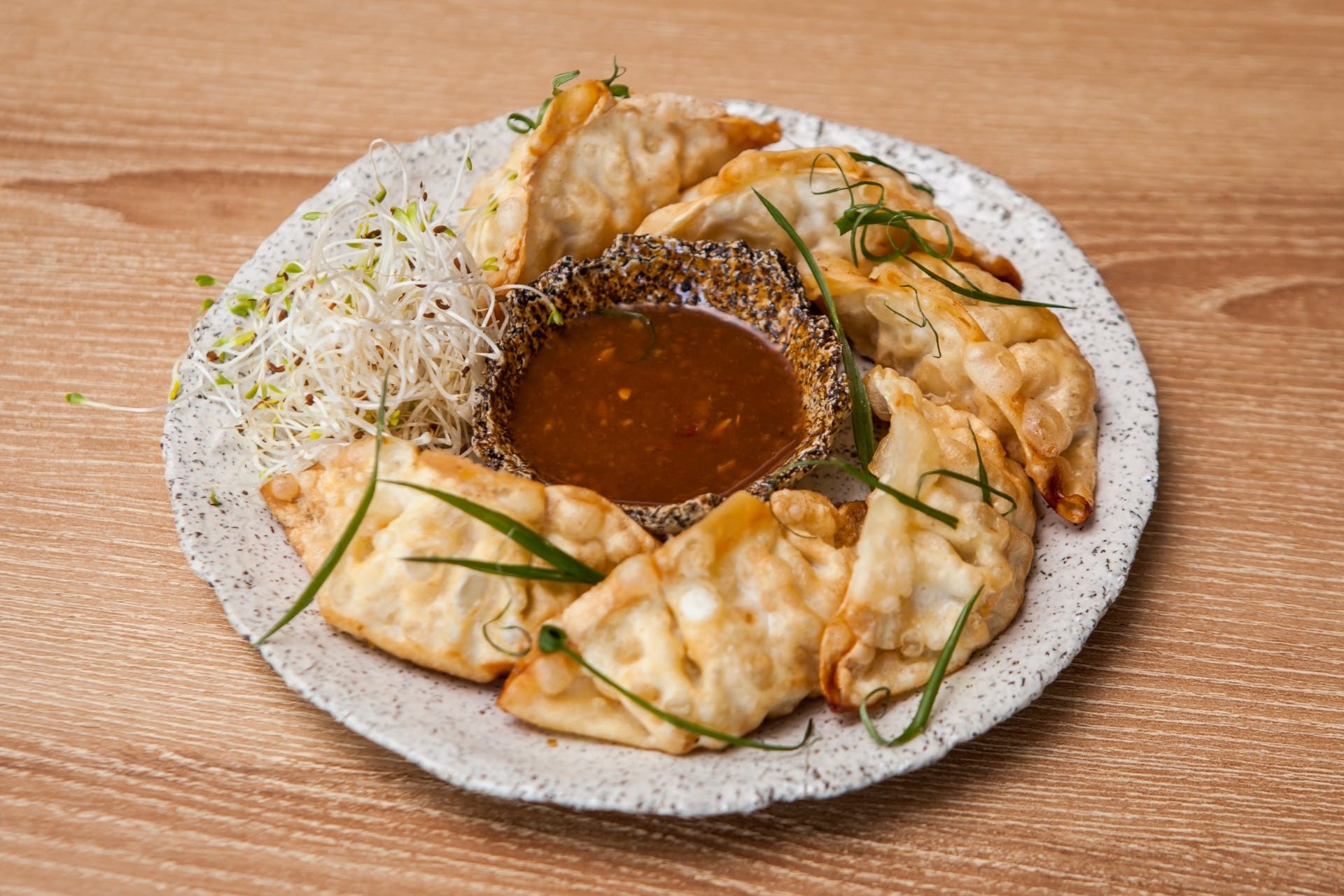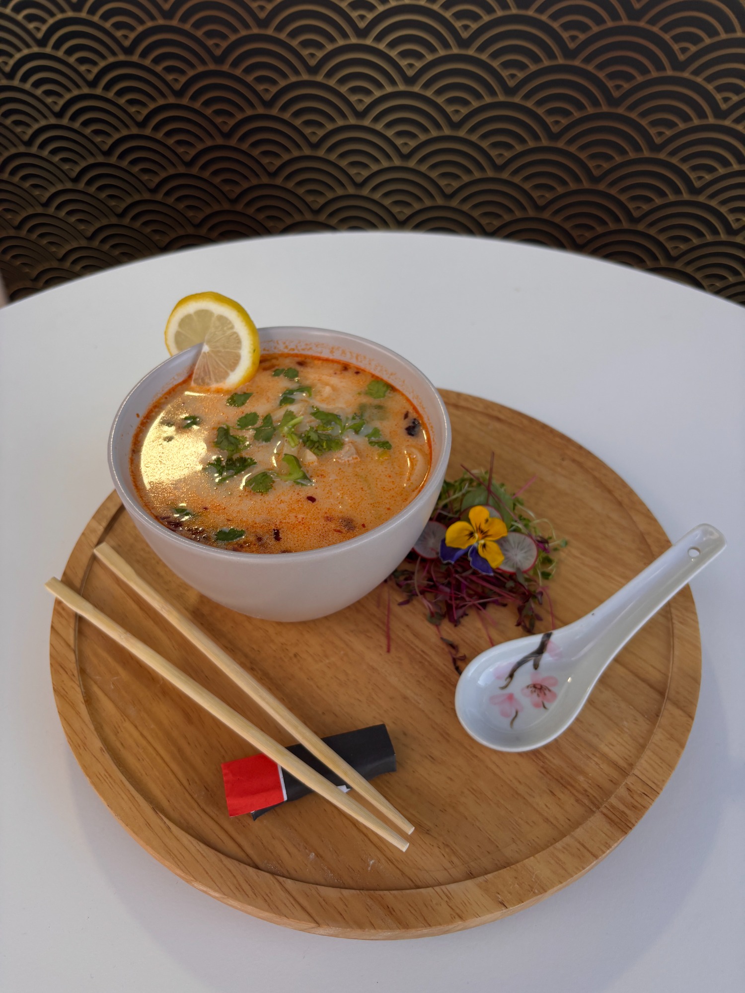Grzybki shiitake, groszek cukrowy, por w tempurze, ogórek, spicy-mayo,obłożone ośmiornica z masłem KOLENDROWYM