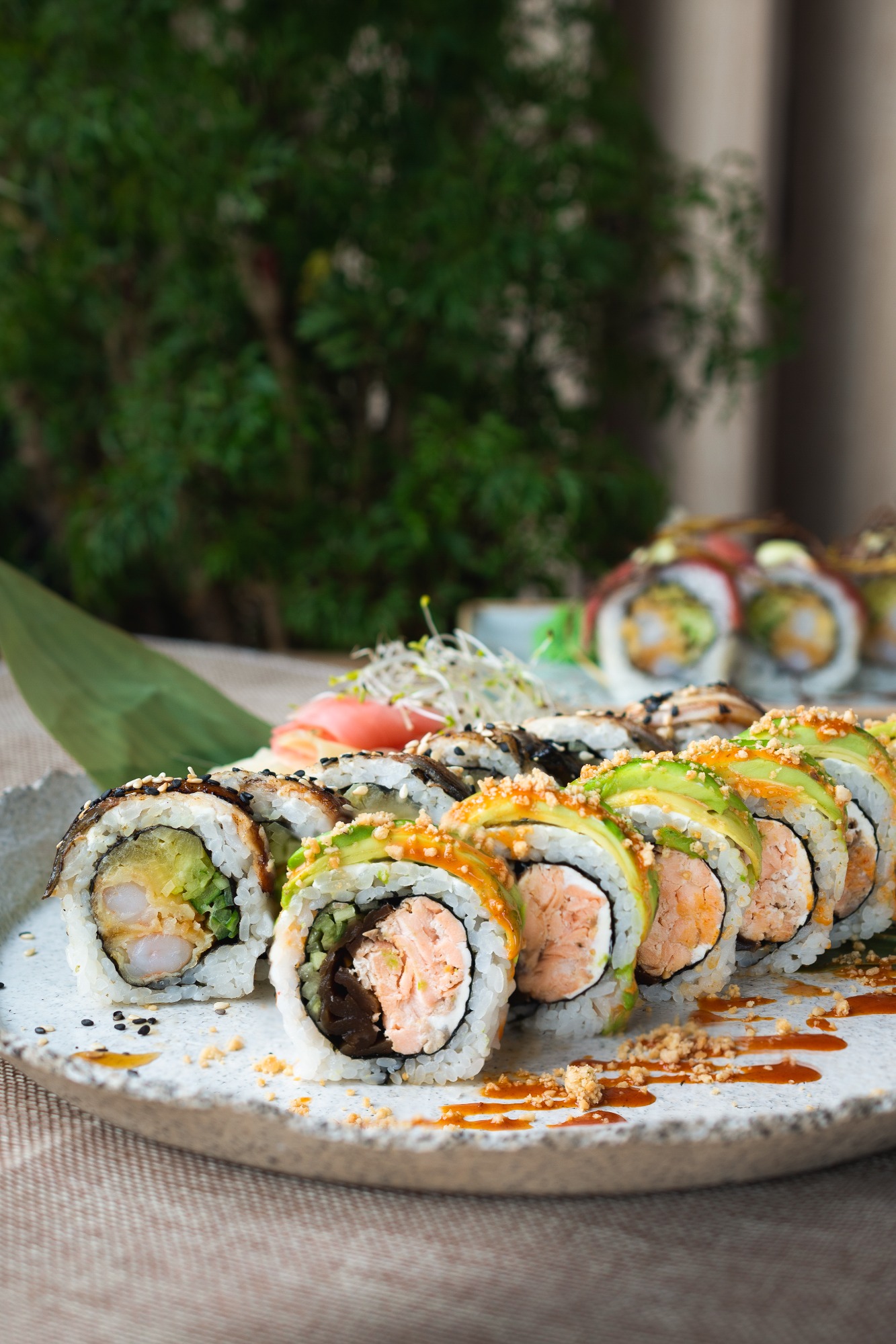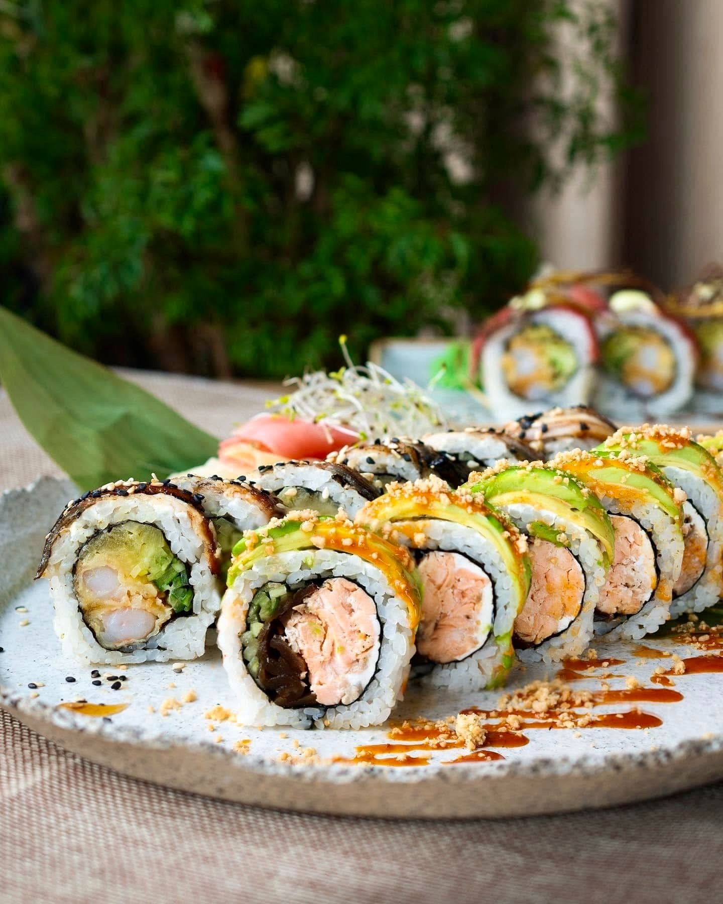cała rolka w panierce w panko, awokado, ogórek, tykwa, rzepa, serek, polana sosem sweet&spicy, posypana kruszonymi orzeszkami