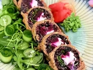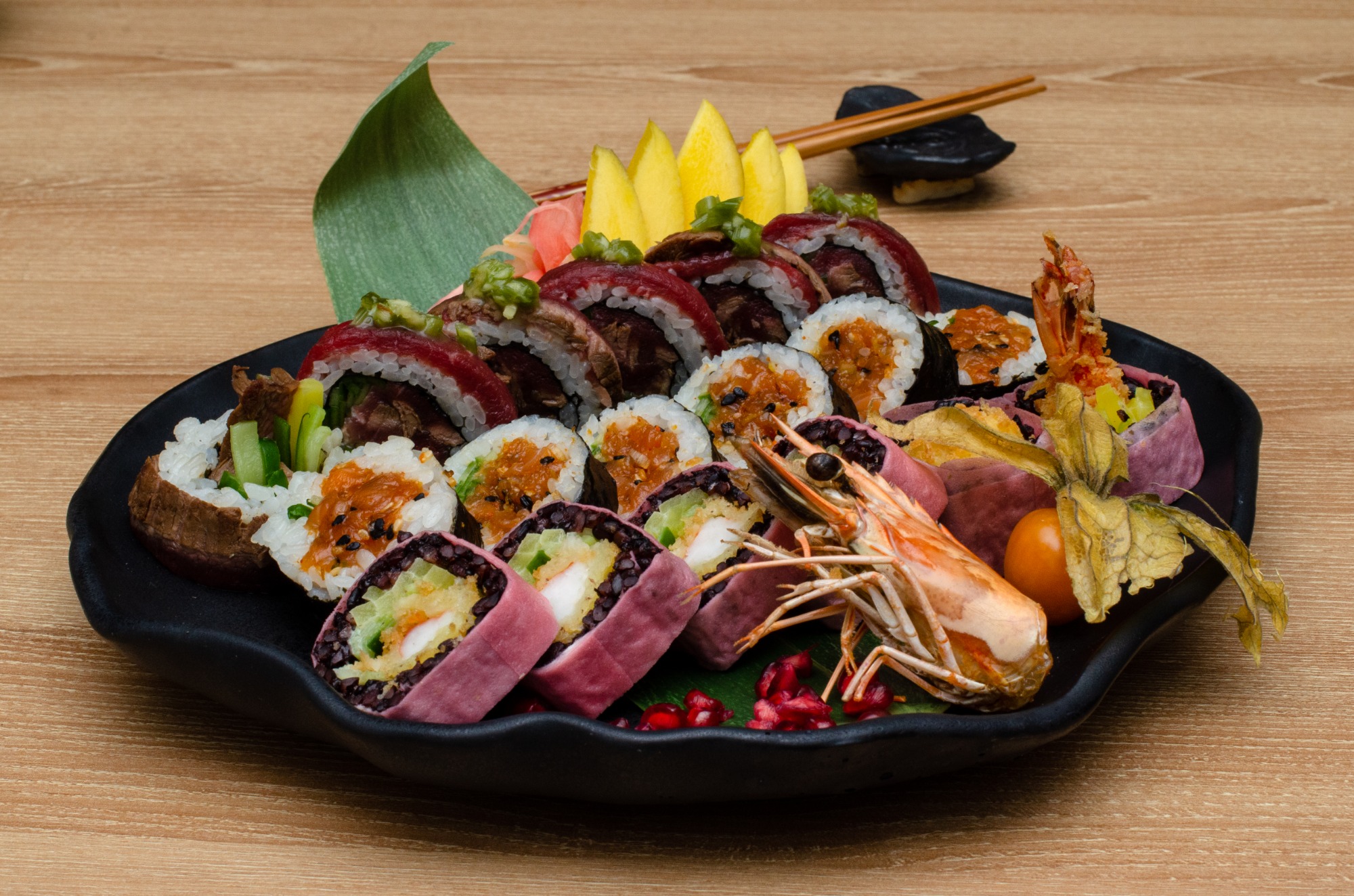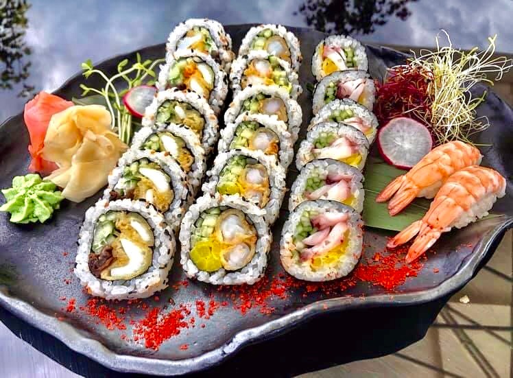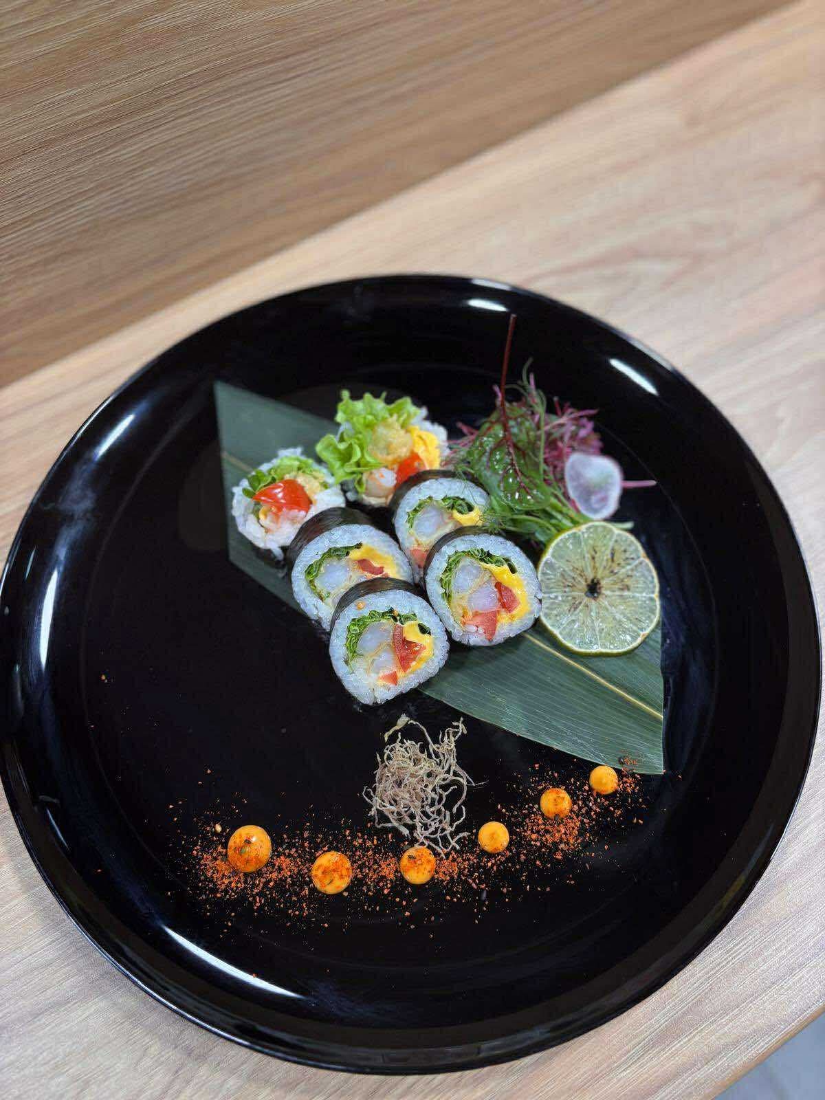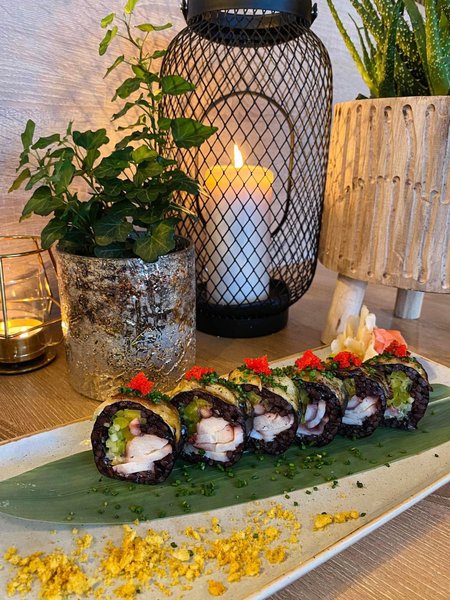 krewetki w tempurze, ogórek, spicy mayo, czarny ryż, płatek sojowy -