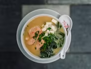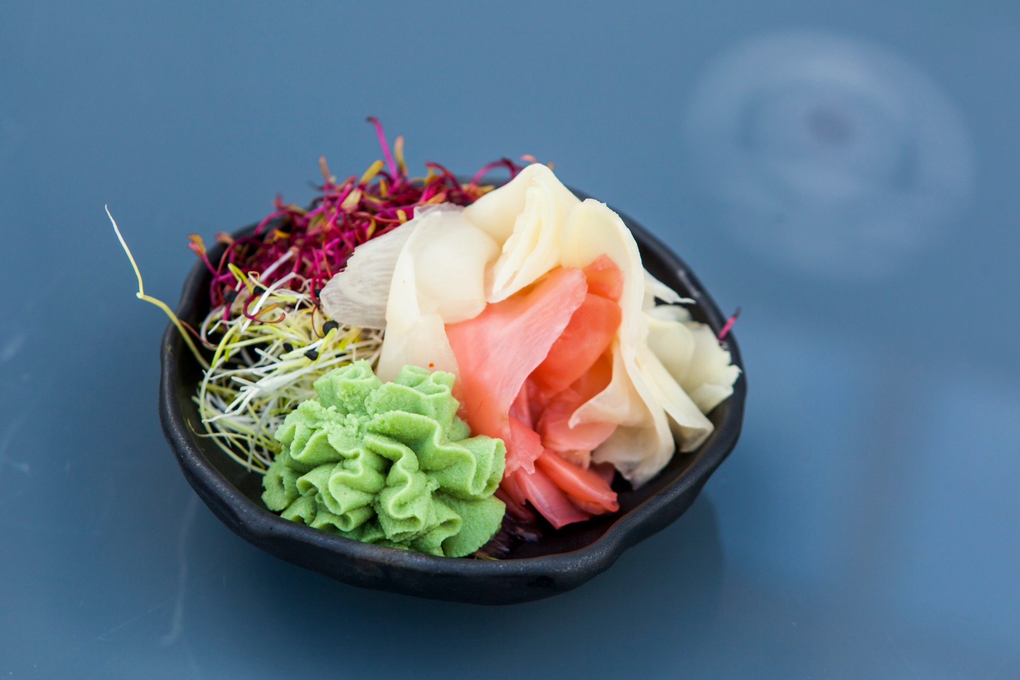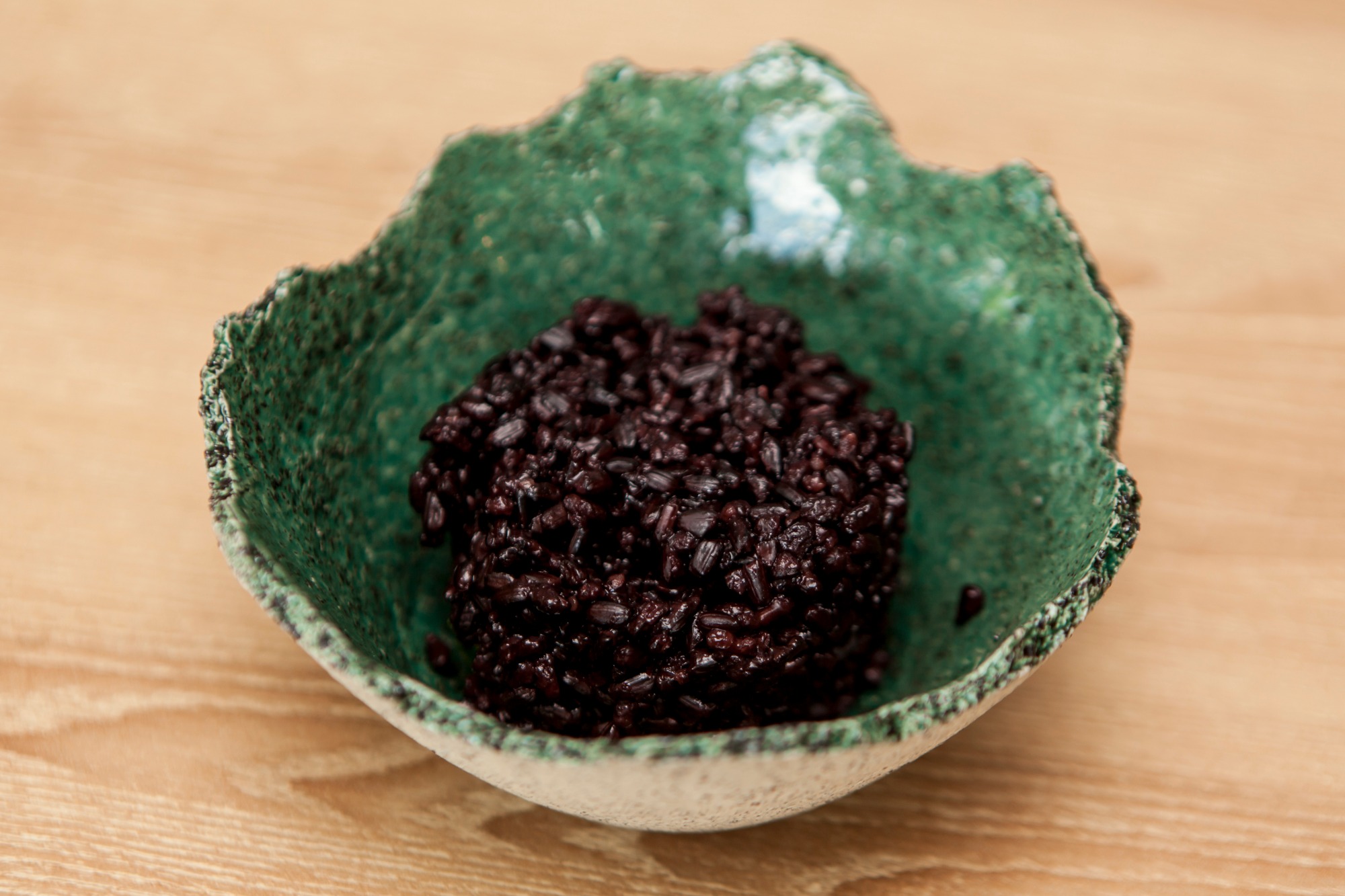 krewetka tygrysia w panco, ogórek, rzepa, czarny ryż, serek, płatek sojowy