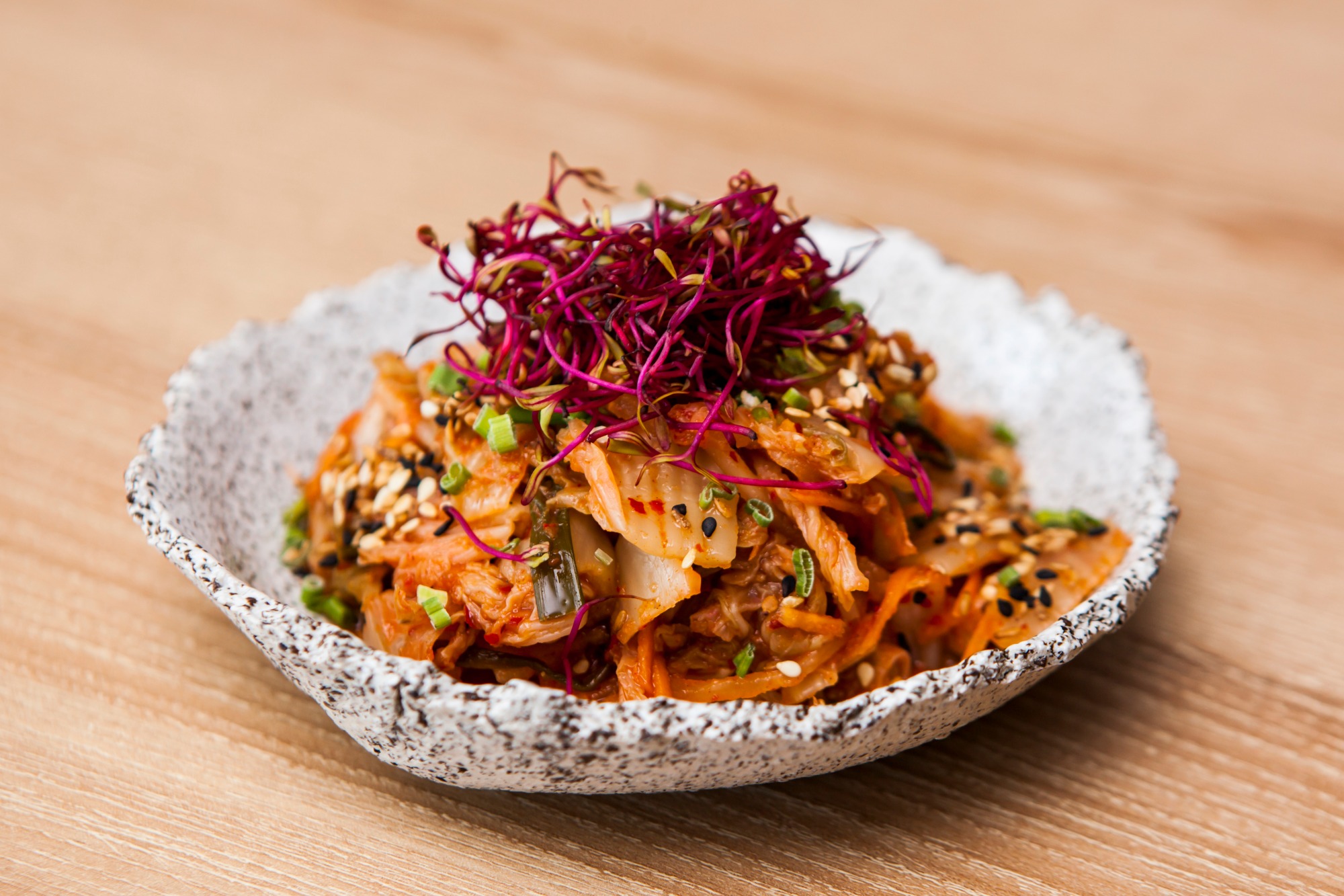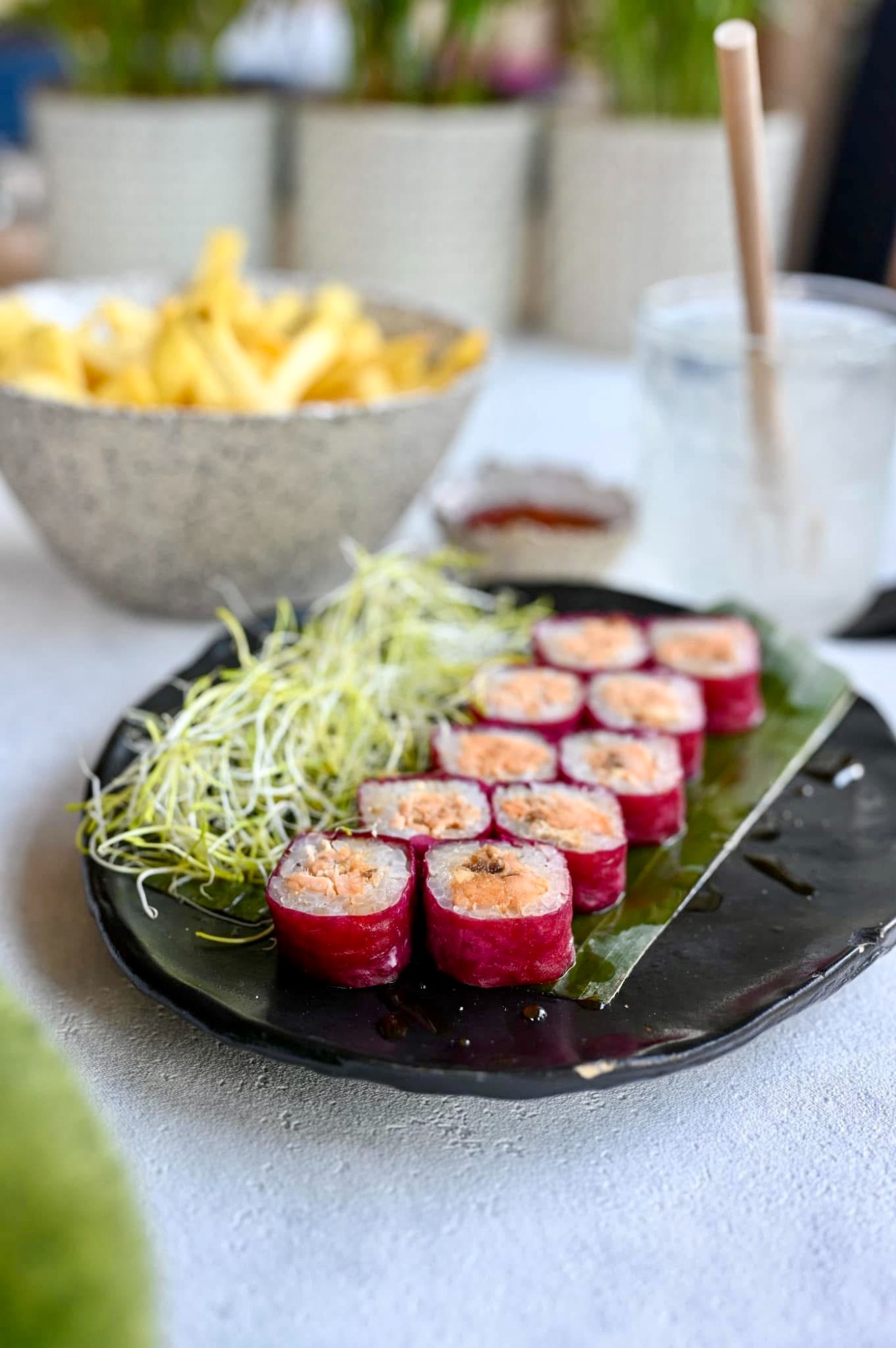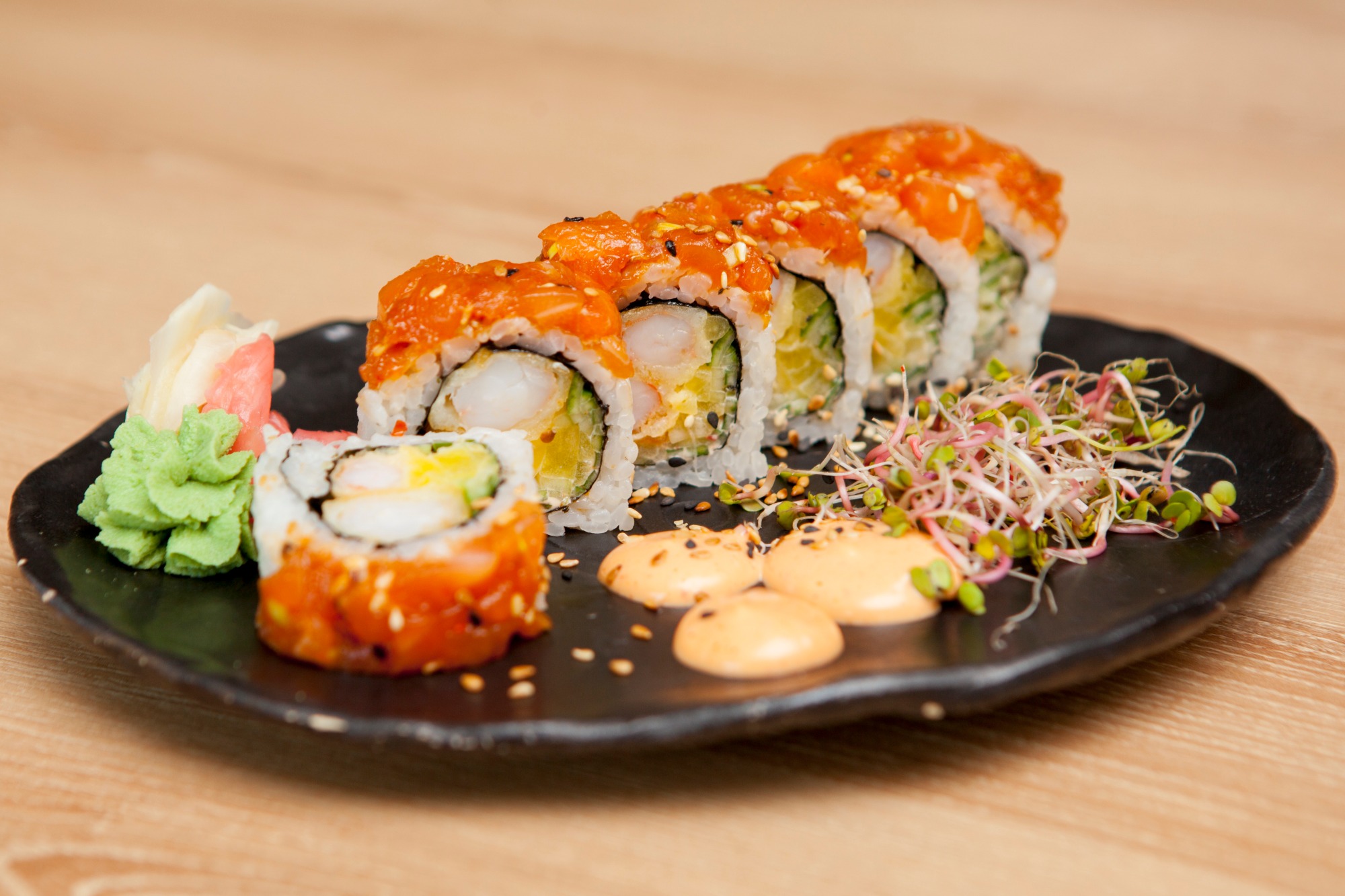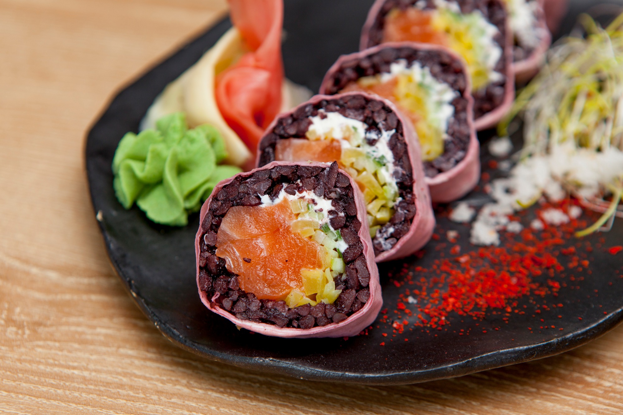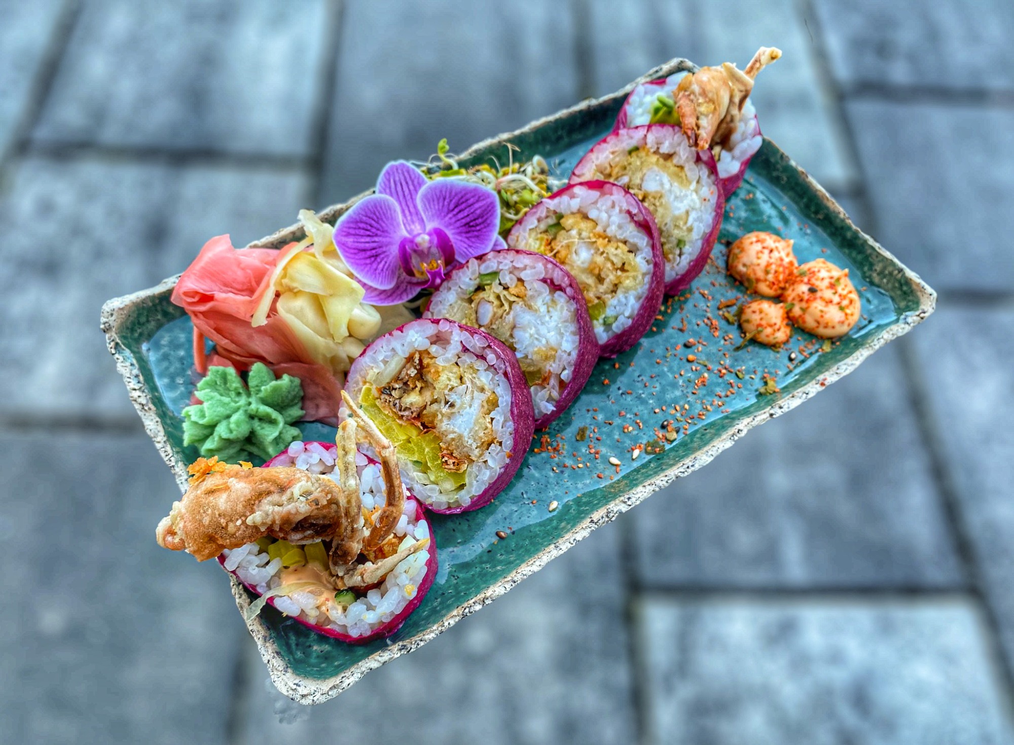 krab smażony w panierce panko, kimchi, rukola, spicymayo, owinięty opalanym łososiem i posypany chipsami z topinamburu, czarny ryż -