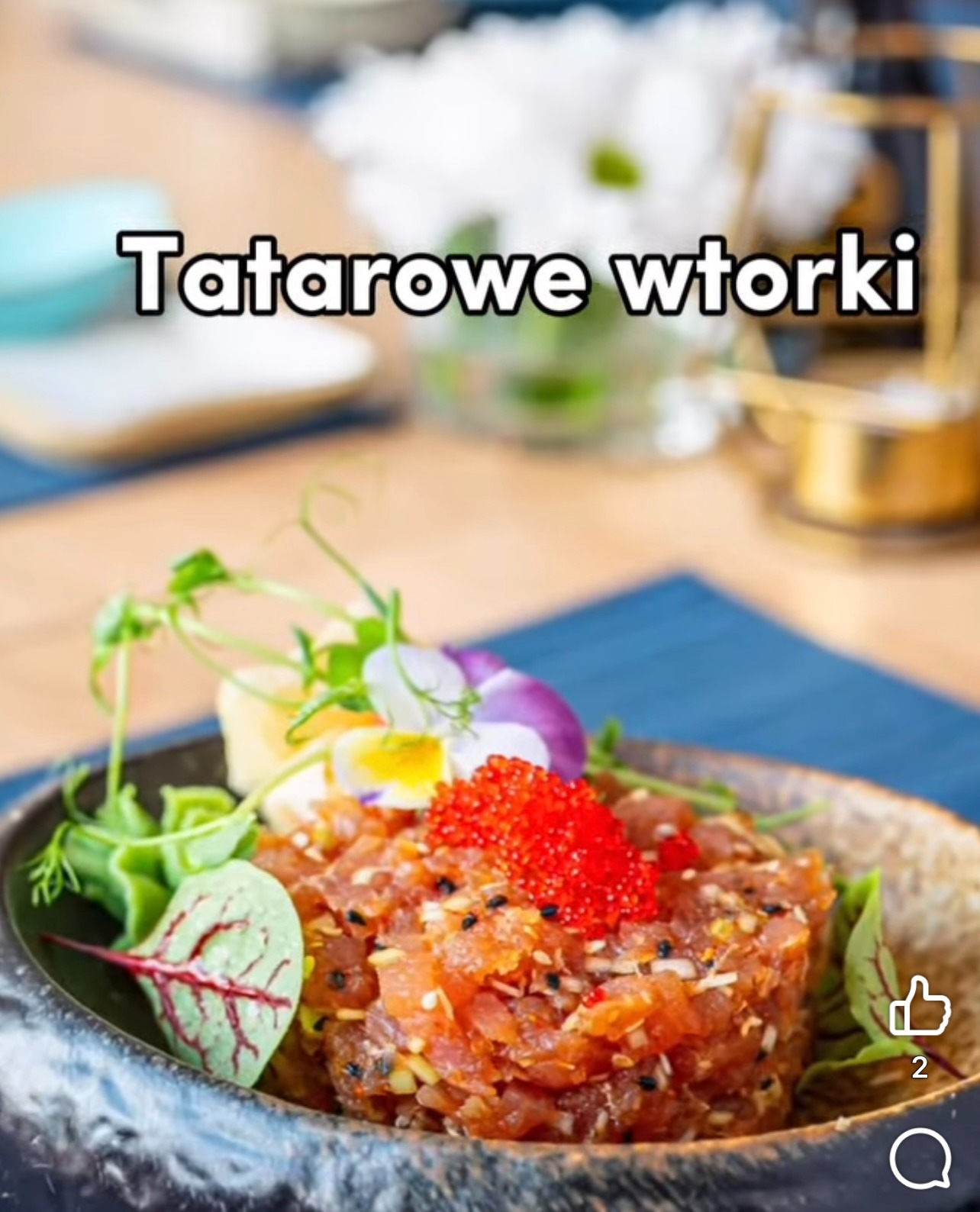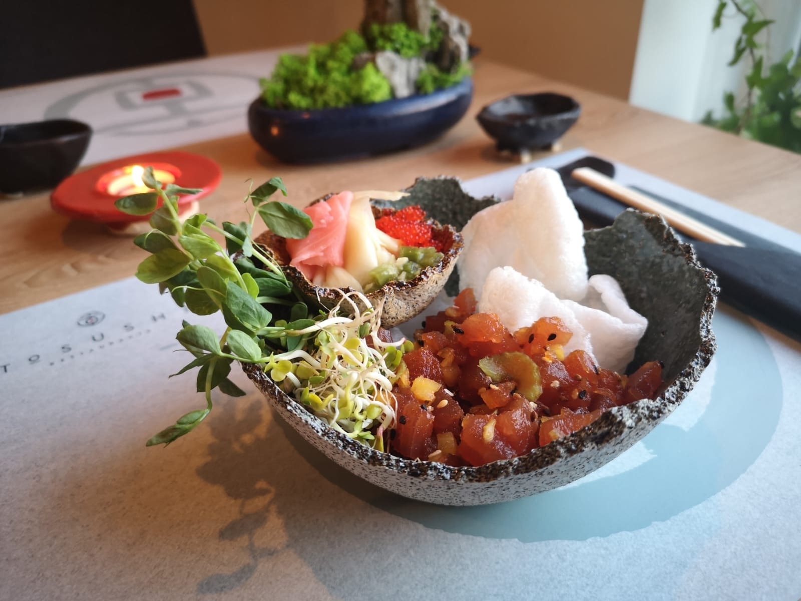 krewetki w tempurze, rzepa, ogórek, spicy mayo, obłożone tatarem z tuńczyka -